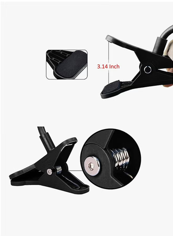 360° Rotating Ball When adjusting the device angle with this method, please take care to rotate the ball slowly then screw it up after finishing angle adjusted.This holder may NOT be suitable in cars for most people because of its long arm.Suitable for most of phone screen sizes, such as iPhone 6, 6 plus, 6s, 6s plus, 7, 7 plus, 5, 5s, 4, 4s, iPod, GPS, PDA, HTC, Nokia, LG, Blackberry, etc.The Phone holder is totally 29.5'' inches in length with its biggest holder size of 4.7'' inches and maximum clamping thickness of 3.14'' inches.Designed with flexible long arms clamp, working at 360-degrees, making holder adjustable to view your device at any angle. Made of high quality aluminum-magnesium alloy material.Cell Phone Holder, Perfect for watching movies & enjoying music & playing phone games in bedroom, gym, office, exhibition and any other places. Fits for most cell phones up to max width 90mm. Quick and easy installation.